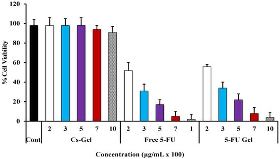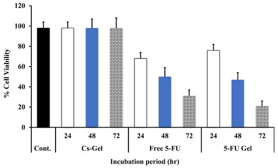 As shown in Figure 3, all medicated groups (either free 5-FU or 5-FU -loaded Cs/β-CD + PL hydrogel showed a significant (p ˂ 0.05) higher tumor cell viability inhibition when compared with either blank or untreated groups. Interestingly, the non-loaded hydrogel had a little inhibitory effect on tumor cells, which was attributed to the interaction of positively charged Cs polymer with the negatively charged cancerous cells [,,,]. Moreso, it was observed that the longer the treatment time, the more extensive the inhibition effect. In the case of free 5-FU, the extent of cell viability inhibition was 70%, 52%, and 34.25% cell viability for 24, 48, and 72 h incubation periods, respectively. Whereas, in the case of 5-FU loaded Cs/β-GP + PL hydrogel, the cell viability values were 80%, 50%, and 20.6% for 24, 48, and 72 h incubation periods, respectively. The results showed that the loaded Cs/β-GP + PL hydrogel was found to have a significant (p ˂ 0.05) anti-proliferation capacity, especially for MCF-7 cells at 72 h with 20.61% cell viability compared with 34.25% viability for a free 5-FU solution. These results indicated that the drug-loaded gel has an extended duration of action. In contrast, at the 24 h incubation period, it was observed that 5-FU solution had a higher inhibitory impact on cell viability compared with the drug-loaded gel group. This may be due to the partial dilution effect of non-toxic Cs polymer existing within the composition of gel.
