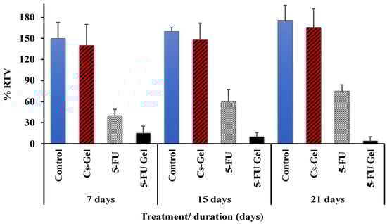 Interestingly, the group treated with non-loaded Cs/β-GP + PL showed a partial tumor growth inhibition compared with the untreated control group but was not significant. This finding may be attributed to the ability of chitosan polymer to penetrate cancer cell membranes bearing negative charges [,]. This result confirms the previously obtained data of cell viability studies (Figure 3 and Figure 4). For the same reason, the hydrogel-loaded 5-FU showed a significant growth inhibition (i.e., lower tumor volume, 12% RTV) compared with free drug (i.e., higher tumor volume, 40% RTV) after 7 days. The activity of the modified gel was extended for more than two weeks (8% RTV) but the free drug activity was diminished by time (60% RTV) due to its short duration of action. The obtained results and interpretation were in good agreement with the reported data [,].