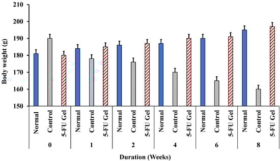 The animal’s weight and survival rates of treated animals were monitored for an additional four weeks after treatment to follow up on the toxic side effect of chemotherapeutic drugs. Generally, the results, as illustrated in Figure 6, showed a significant (p < 0.05) weight loss in the control untreated group compared with the 5-FU-loaded Cs/β-GP + PL hydrogel receiving group. These results may be due to alleviating the side effects of free drugs through sustained release []. Especially, by the end of week three, it was observed that there was a significant difference between the groups (p < 0.05) from the third week to the end of the experiment since it was observed that the body weight of the investigated rats was around 190 g in the case of both normal and treated groups. However, the body weight decreased with time to 173, 165, and 159 g at weeks 4, 6, and 8, respectively. The results, illustrated in Figure 6, showed that the rats receiving 5-FU displayed weight loss throughout the first 7–10 days of the experiments. In contrast, the rats receiving 5-FU-loaded hydrogel had weight curves nearly similar to those of the ordinary animals (-ve control group).