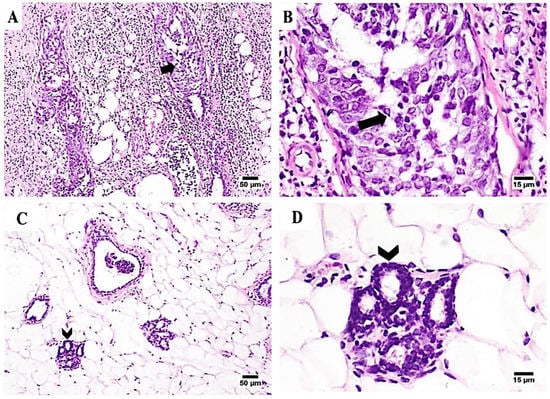 Photomicrographs showing the histopathological traits observed on tumor-induced mammary gland tissues. (A,B) Non-treated mammary gland showing malignant cells proliferation (arrows); H&E 100×, and 400×, respectively. (C,D) Mammary gland treated with chitosan hydrogel showing proliferating neoplastic cells forming ducts, without inward growths, cells clusters, or sheets, with mild inflammatory cells infiltration (chevrons); H&E 100×, and 400×, respectively.