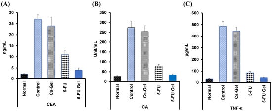 The serological examination of breast cancer in the blood, both CEA (Figure 8A) and CA (Figure 8B), were quantitatively determined. The CA marker was measured to determine the presence of breast cancer, while CEA indicates the progression of cancer to other tissue or organs. Figure 8A–C showed the recorded tumor parameters for all groups over two weeks of treatment. The results indicated that both the investigated parameters were high in control and blank Cs–Gel, which showed a 14-fold higher level of tumor markers than the normal (tumor-free group). The values of both the two tumor parameters were reduced significantly (p ˂ 0.05) in all treated groups, with the highest extent of reduction obtained in the case of 5-FU loaded Cs/β-GP + PL. Similarly, it was found that the level of TNF-α (Figure 8C) was significantly elevated (490 pg/mL ) in the case of the control group that received no medication, compared with normal rats (25 pg/mL). In contrast, its level was reduced significantly (p ˂ 0.05) by the injection of antitumor since 5-FU loaded Cs–Gel showed the highest effect (45 pg/mL) compared to free 5-FU treated groups (32 pg/mL). The obtained data are in agreement with the obtained histopathological data (discussed above) which showed a reduction in swelling and inflammation accompanying the tumor proliferation.