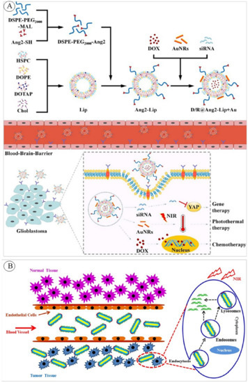 GNRs could also be applied for targeted oligonucleotide delivery [139]. For example, DNA and RNA strands are stabilized on the surface of GNRs in different nanosystem designs for brain drug delivery. GNRs have been applied in a nanosystem designed for glioblastoma therapy by combining thermal therapy and inhibiting a protein expression, which is expected to make the glioblastoma more sensitive to chemotherapy [131]. The system consists of a liposome with a cationic-charged surface, modified by angiopep-2 peptide and loaded internally with DOX (a chemotherapeutic agent) and externally with GNRs (photothermal therapeutic agents) and yes-associated protein siRNA (YAP-siRNA), responsible for inhibiting the expression of YAP protein (Figure 2A). The system showed good tumor growth inhibition effects and could pass the blood–brain barrier [131].