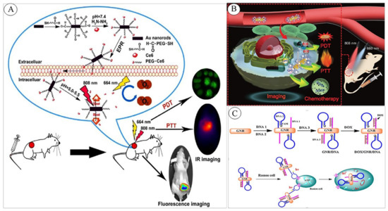 The integration of diagnostic imaging and therapy, called theranostics, has emerged as an advancing field for high-performance cancer treatment. Hence, the majority of current studies have been reported on developing potential cancer theranostic agents. According to the imaging techniques, bio-imaging is universally preferred, as it is a non-invasive procedure for in situ visualization and offers real-time tracking of biological processes. So, GNRs are an excellent candidate for bio-imaging and photothermal therapy, due to the capability of local heat generation, triggered by laser beam [165]. GNRs can be applied solely or simultaneously by other imaging techniques such as PA imaging and positron emission tomography (PET) to improve both the imaging’s resolution and image-guided therapy [166,167,168,169,170,171]. Herein, Zhang and his colleagues designed a nanosystem as a theranostic platform by using chlorin e6 (fluorescent tag)-conjugated gold nanorods (Ce6-PEG-GNRs), resulted in enhancing the efficiency of therapy, because of dual PTT/PDT, and precisely-tumor tracking of nanosystem by pH-responsive fluorescent and IR imaging (Figure 4A) [72]. The combination of multimodal therapeutic method (photothermal, photodynamic and chemotherapy) and diagnosis was also shown in another study in which two different wavelength laser radiation (660 nm, 808 nm) were used to elevate the effect of treatment (Figure 4B) [172]. Drug delivery potency of GNRs can also be integrated with biomarkers to track a drug’s local release. Guo et al. designed such a system for targeted delivery of DOX and detection of intracellular ATP. The system was composed of GNRs, modified by three types of DNA (DNA1: complementary DNA sequence for ATP aptamer, DNA2: Ramos cell aptamer, DNA3: ATP aptamer) and loaded by DOX. The immobilization of ATP aptamers and Ramos cell aptamers made GNRs capable of specific recognition of tumor sites. The presence of ATP caused the release of DOX from the nDDS and increased its fluorescence intensity related to the ATP concentration (Figure 4C) [173].