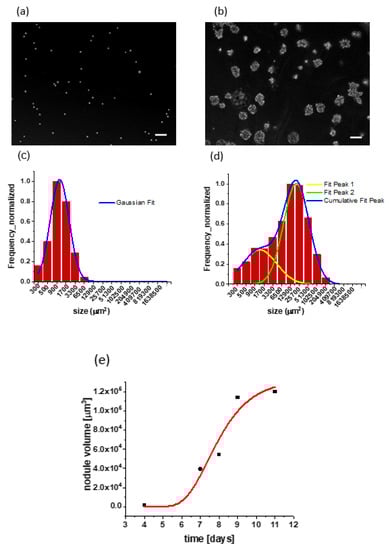 Longitudinal monitoring of 3D culture growth: (a) darkfield images show adherent single cells clearly visible at day zero. Scale bar is equal to 100µm; (b) heterogeneous multicellular tumor nodules are formed at day seven. Scale bar is equal to 100µm; (c) the first visible signs of heterogeneity appear on day four. Although one Gaussian fit is applied, the first two bars represent the beginning of another peak formation. The size of cancer nodules given in square micrometers corresponds to the area of a 2D projection (from 2D image data) of a 3D tumor nodule; (d) bimodal size distribution of 3D nodules at day seven in which the first peak corresponds to a smaller population with a mean size of about 1300 µm2, and the second peak includes a larger population with a mean size of 19,300 µm2; (e) growth kinetics plot (Gompertzian fit): average size of A549 3D nodule over time. The 3D nodule grew from day zero to day nine, when it reached a plateau due to stagnation in further growth.