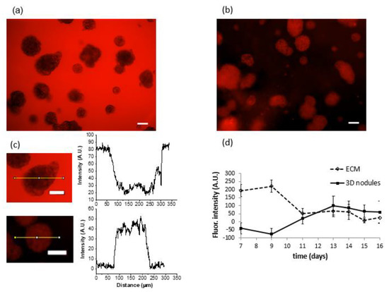 Longitudinal monitoring of fluorescence intensity from fluorophore-labeled GNPs: (a) after 45 min of cancer nodule exposure to GNPs, Matrigel appeared red due to GNP localization within the ECM. Due to a strong interaction of Matrigel and GNPs, particles were incapable of migrating immediately to cancer nodules and are retained in the matrix. Scale bar is equal to 100 µm; (b) a 3D nodule of A549 lung cancer at day 13, which was 6 days after exposure to GNPs. Most of the GNPs moved from the Matrigel to cancer nodules, which turned red due to fluorophore presence, while Matrigel appeared black. Scale bar is equal to 100 µm; (c) the intensity drop between Matrigel and a nodule at day 1, as well as the intensity jump at day 6, are also confirmed using ImageJ software. Scale bar is equal to 100 µm; (d) fluorophore intensity in the ECM (dashed line) and in the nodules (solid line) with standard error (SE), n = 3. Light emitted by fluorophore accumulation in Matrigel decreased over time unlike light intensity emitted by fluorophore in cancer cells. Light intensity emitted by tumor nodules constantly increased and reached the maximum at day 13, which was 6 days after the addition of GNPs. In order to obtain the appropriate intensity, a control group was used to determine the background, which was subtracted from each individual image.