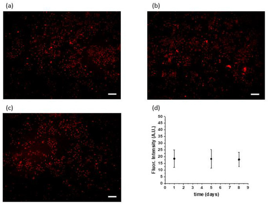 Monolayer cultures of A549 cancer cell line with GNPs inside at (a) day one, (b) day five, and (c) day eight. No significant difference was observed in GNP accumulation in cells over time, given that most GNPs are absorbed during the first 24 h; (d) n = 3. (a–c) Scale bar is equal to 200 µm.