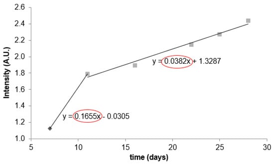 Intensity curve representing the ratio of the average nodule and Matrigel intensity over 28 days gives a broader picture of GNP behavior in a 3D model. GNP uptake by nodules was most rapid up to day 11 of nodule growth (during the first 4 days after the addition of labeled nanoparticles). After this period, uptake slowed down due to lower GNP concentration in Matrigel, confirmed by a slope 2 (11–28 days) value (0.0382), which is more than four times less than slope 1 (7–11 days) value (0.1655).