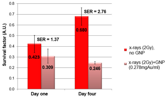 Radiation treatment response wo/w GNPs in a 3D model. Treatment enhancement depended on localization of GNPs. Bars with SE (n = 3) represent the post-radiation clonogenic survival factors wo/w GNPs after one day and four days of accumulation. The presence of GNPs enhanced radiation effectiveness, but a four-day accumulation period showed doubled SER, compared with one day (ml = mL).