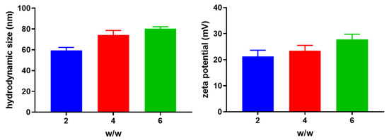 The hydrodynamic size and zeta potential of Chol-PCX/miRNA nanoparticles prepared at different w/w ratios were measured using DLS. The particle size increased slightly from 60 to 80 nm with an increase in the polymer/miRNA w/w ratio (Figure 2). The zeta potential of the nanoparticles also increased slightly along with the enhanced w/w ratio.
