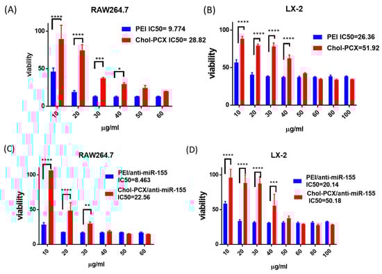 Cytotoxicity of Chol-PCX and Chol-PCX/anti-miR-155. (A,B) Cell viability of the polymers after 24 h of incubation with the macrophage RAW 264.7 and HSC LX-2. (C,D) Cell viability of Chol-PCX/anti-miR-155 after 24 h of incubation with the macrophage RAW 264.7 and HSC LX-2. Data were analyzed by one-way ANOVA followed by Tukey’s comparison test. Data are expressed with mean ± SD. * p < 0.05, ** p < 0.01, *** p < 0.001, and **** p < 0.0001.