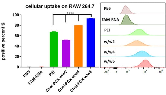 To evaluate if Chol-PCX facilitates effective intracellular uptake and trafficking for miRNA delivery, we measured cellular uptake in the macrophage cell line. We used nanoparticles prepared with fluorescently labeled FAM-RNA. Cell uptake, expressed as the % of fluorescence-positive cells, was increased from 50% to 93% as the w/w ratio of Chol-PCX/RNA increased from two to six. The uptake was comparable or higher than the control PEI (Figure 4). Nanoparticles prepared at w/w four had a relatively small size, moderately positive zeta potential, and good cellular uptake. Thus, w/w four was chosen for most subsequent in vitro and in vivo experiments.