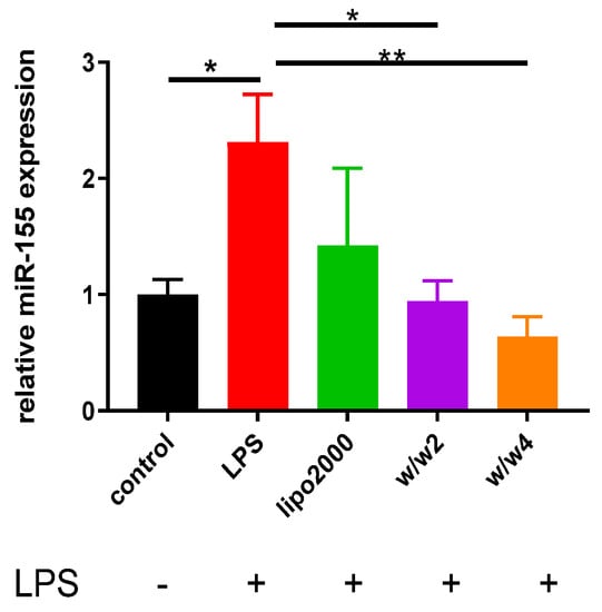 In vitro knockdown effects of Chol-PCX/anti-miR-155 were evaluated in the RAW 264.7 cells (Figure 5). We used LPS, an endotoxin related to the pathogenesis of AALD, to activate the macrophages and induce miR-155 overexpression [19]. The cells treated with LPS showed a two-fold increase in the expression of miR-155 over the control group. Lipofectamine 2000/anti-miR-155 was used as the positive control, and it silenced 38% of miR-155 expression. Chol-PCX/anti-miR-155 outperformed the Lipofectamine 2000 control at both w/w ratios as it decreased the miR-155 expression by 59% (w/w two) and 72% (w/w four).