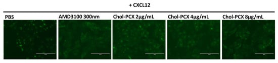 The CXCR4 antagonism efficacy of Chol-PCX was determined by a CXCR4 redistribution assay. Human epithelial osteosarcoma U2OS cells with EGFP-CXCR4 fusion protein (Fisher Scientific Waltham, MA, USA) were cultured in DMEM supplemented with 2 × 10−3 M L-glutamine, penicillin (100 U/mL), streptomycin (100 μg/mL), G418 (0.5 mg/mL), and 10% FBS. The cells (8000 cells/well) were seeded in black 96-well microplates. After 24 h, the cells were washed with an assay buffer and treated with Chol-PCX at different concentrations for 30 min. AMD3100 (300 nM) was used as a positive control. The CXCL12 (10 nM) was added and incubated for 1 h. Cells were fixed and visualized using EVOS xl microscopy under the GFP channel.