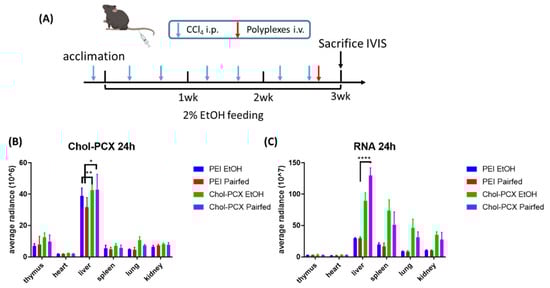 Biodistribution of Chol-PCX and PEI Cy5.5-siRNA nanoparticles. (A) Mice were treated with CCl4 for 3 weeks and fed 2% EtOH or a control diet, with the intravenous (IV) injection of the nanoparticles at the end of feeding. (B) Distribution in different organs 24 h after the IV injection of nanoparticles. (C) RNA distribution in different organs 24 h after the IV injection of nanoparticles. Data were analyzed by two-way ANOVA followed by Tukey’s comparison test. Data are expressed as mean ± SD (n = 6). * p < 0.05, ** p < 0.01, and **** p < 0.0001.