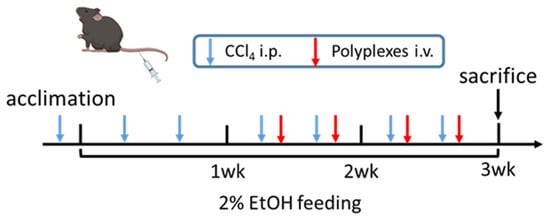 All animal experiments were performed in C57BL/6 female mice purchased from Jackson Laboratories and following the protocol approved by the University of Nebraska Medical Center Institutional Animal Care and Use Committee. An AALD fibrosis model was established by feeding the mice an EtOH-containing Lieber–DeCarli (LD) daily liquid diet (Dyets Inc., Bethlehem, PA, USA) combined with repeated intraperitoneal injection of CCl4 for 3 weeks, modified from a previous report [30]. In brief, on day 0 mice were started on 1% (v/v) EtOH LD liquid diet or control isocaloric liquid diet without EtOH for two days. Starting on day 3, the mice were injected twice per week with CCl4 (1 mL/kg of 10% CCl4 in olive oil) and fed with 2% EtOH LD liquid diet or the control isocaloric diet. The daily intake of the EtOH mice was monitored, and the following day the equivalent calories were administered to control mice. Starting the second week, mice were injected twice with the treatment or control nanoparticles. All nanoparticle treatments were given 24 h after a CCl4 injection. There were four treatment groups, with 6 mice per group: (i) pair-fed control, (ii) EtOH LD diet + CCl4 + PBS, (iii) EtOH LD diet + CCl4 + Chol-PCX/anti-miR-NC, and (iv) EtOH LD diet + CCl4 + Chol-PCX/anti-miR-155. Nanoparticles (10 μL/kg) were injected via tail vein at a dose of 1 mg/kg of miRNA and a polymer/miRNA ratio of 4. Mice were sacrificed 24 h after the last treatment and the liver tissues as well as the blood samples were collected. The livers were stored in RNAlater (Qiagen, Valencia, CA, USA) or 10% formalin. The mRNA expression of fibrotic markers was analyzed by SYBR Green RT-PCR. Extracted RNA (2 µg) was converted into cDNA using a High-Capacity cDNA Transcription Kit (Applied Biosystems, Waltham, MA, USA). The PCR reactions were run on Rotor-Gene Q (QIAGEN) equipment with iTaq Universal SYBR Green Supermix (Bio-Rad, Hercules, CA, USA) and GAPDH as a housekeeping gene. Relative mRNA levels were calculated based on the comparative threshold value (Ct) method. The serum concentration of alanine transaminase (ALT) and aspartate amino transaminase (AST) was determined by a VITROS 5.1 FS Chemistry System (Ortho Clinical diagnostics) at the Omaha VA Medical Center Clinical Chemistry Laboratory.
