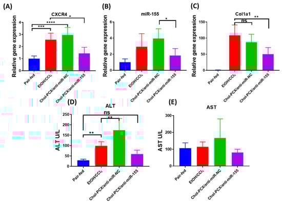 (A–C) Effect of treatment on hepatic CXCR4, Col1a1, and miR155 gene expression. (D,E) Serum ALT and AST. Data were analyzed by one-way ANOVA followed by Tukey’s comparison test. Data are expressed as mean ± SD (n = 6). * p < 0.05, ** p < 0.01, *** p < 0.001, and **** p < 0.0001, ns not significant.