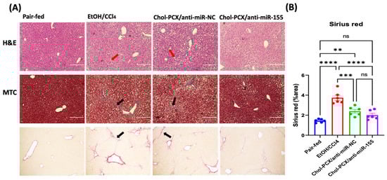 Therapeutic efficacy of Chol-PCX/anti-miR-155 in AALD fibrosis. (A) Hematoxylin and eosin stain (H&E), Masson’s trichrome stain (MTC), and Sirius Red stain for liver tissues in different groups. Red arrows in H&E represent fat droplets, black arrows in MTC or Sirius Red represent bridging fibrosis. (B) Sirius Red quantification for collagen deposition by ImageJ. Data were analyzed by one-way ANOVA followed by Tukey’s comparison test. Data are expressed by mean ± SEM. ** p < 0.01, *** p < 0.001, and **** p < 0.0001.