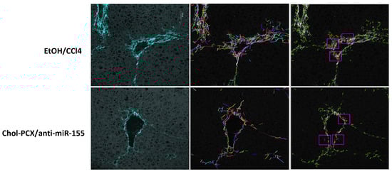 Further confirmation of the antifibrotic effects of the Chol-PCX/anti-miR-155 particles was performed using SHG microscopy to image collagen and its molecular organization [41]. AALD fibrosis has a pericentral vein pattern of collagen accumulation, which can be differentiated from most chronic liver diseases, where fibrosis is mainly located around portal veins [42]. Collagen fibers were imaged at 860 nm in the untreated AALD fibrosis and animals treated with the Chol-PCX/anti-miR-155 nanoparticles (Figure 11). Images were collected from central venules in a blinded fashion. We observed decreased number of fibers and decreased fiber length in the nanoparticle group relative to the untreated group. There were no additional differences or trends in collagen fiber curvature. Standardized 50 µm square ROIs were used to calculate the average collagen fiber counts at the central vein (excluding the surrounding tissue). Three independent ROIs were measured and then averaged to determine the average collagen fiber number/count and assess the alignment of those fibers relative to each other. There was no difference in the alignment, but a significantly elevated average number of collagen fibers (150 vs. 133, p < 0.001), fiber length (48 vs. 46.5, p < 0.01), and width (3.95 vs. 3.79, p < 0.001) associated with the 50 μm sampling ROIs at the central vein was observed for the untreated group.