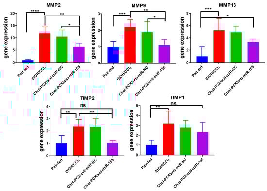 Further analysis of the liver samples showed the enhanced expression of crucial fibrosis markers, including MMPs and TIMPs, that play an important role in extracellular matrix remodeling. It has been previously reported that an increase in these markers correlates with miR-155 expression in AALD; however, no changes were seen in miR-155 KO mice [19]. In our study, the mRNA expression levels of MMP-2, -9, and -13, as well as TIMP 1 and 2, were significantly increased in the untreated AALD fibrosis group. Treatment with Chol-PCX/anti-miR-155 particles resulted in a significant reduction in all the analyzed fibrotic markers (Figure 12).