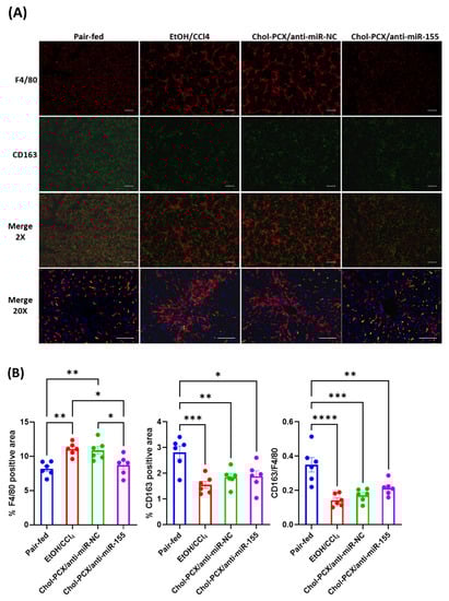 Alcohol and associated metabolites can initiate hepatic inflammation, which contributes to the progression of AALD. An alcohol-induced increase in profibrotic macrophage infiltration was previously observed in wild-type mice compared to miR-155 KO mice [19]. In our study, we analyzed the hepatic accumulation of macrophages by F4/80 immunohistochemistry. Untreated AALD fibrosis samples (EtOH/CCl4 + PBS-injected) showed a “chicken wire” pattern compared with the pair-fed group (Figure 13A). Additionally, the number of F4/80+ macrophages in the EtOH/CCl4 (PBS-injected) group significantly increased when compared with the pair-fed group. The number and distribution pattern of the hepatic F4/80+ macrophages in mice treated with the control anti-miR-NC particles were similar to those of the untreated group. However, the Chol-PCX/anti-miR-155 group clearly had significantly reduced F4/80+ macrophage accumulation than that of the EtOH/CCl4 (Figure 13B) group, to a level comparable to the pair-fed group. Therefore, there was a significant anti-inflammatory effect in the Chol-PCX/anti-miR-155 treatment group compared with the other groups, which contributed to the reversal of AALD fibrosis. Moreover, the CD163+ macrophages decreased in the AALD fibrosis group, indicating decreased M2 polarization in this model. In the Chol-PCX/anti-miR-155 group, there was a slight increase in the CD163+-to-F4/80+ ratio compared with the untreated group, suggesting the start of recovery of M2-polarized macrophages after treatment (Figure 13B). The observed increase in M2 macrophages does not account for the changes observed in the total macrophages. The nanoparticles are thus likely decreasing the M1 macrophages, which contributes to the decrease in total macrophages in the Chol-PCX/anti-miR-155 treatment group.