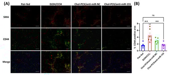 The activation of HSCs in AALD is marked by the overexpression of CD44 receptors. CD44 is highly expressed in tumors but not very common in healthy livers. During fibrosis, however, the proliferation of HSCs is accompanied by increased CD44 expression [43,44]. Here, we illustrate the effect of the nanoparticle treatment on CD44 expression in the liver. α-SMA immunohistochemistry was used for staining the activated HSCs. It was shown that the untreated EtOH/CCl4 group had a significant increase in the number of activated HSCs compared to the pair-fed group. The activation of HSCs was markedly reduced in the Chol-PCX/anti-miR-155 treatment group (Figure 14A). CD44 expression also significantly increased in the untreated EtOH/CCl4 group, and it was at least partly colocalized with α-SMA, confirming expression in activated HSCs. However, a significant amount of CD44 expression did not overlap with α-SMA, also indicating its presence in macrophages and other immune cells. In the Chol-PCX/anti-miR-155 group, CD44 expression was significantly lowered when compared with the untreated EtOH/CCl4 group. The percent of the CD44-positive area was quantified, and the results are shown in Figure 14B. Treatment with Chol-PCX/anti-miR-155 completely reversed the increase in CD44 expression across all the cell types observed in untreated AALD fibrosis.