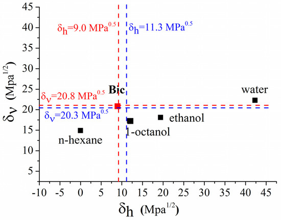 It was emphasized that the Hansen parameters, reflecting the dispersion () and polar () forces, have a similar nature, which is different from the hydrogen bonding (). A very useful tool often used to discriminate the hydrogen bonding from the dispersion and polar forces is a volume-dependent parameter (Table 2) and a Bagley diagram proposed by Bagley et al. [34] representing a dependence of δv against δh. The Bagley diagram for BCL is illustrated in Figure 2. The Bagley diagram visually demonstrates the regularities and the discrepancies disclosed from the Δδt—parameters. Importantly, for BCL δv = 20.8 and δh = 9.0 are close to the region characteristic for the optimal absorption after oral administration estimated by Breitkreutz [35] (δv = 20.3 MPa0.5 and δh = 11.3 MPa0.5), indicating a close proximity to the region where the optimal absorption characteristics in the case of oral administration are located.