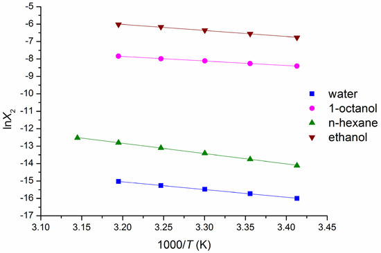 The linearity indicates that the variation of the heat capacity of the solutions with temperature is negligibly small. The temperature dependences of the experimental solubility were treated mathematically by the van’t Hoff equation, and the apparent solution enthalpies were determined as follows: