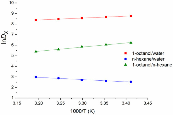 Temperature dependences of the experimental apparent distribution coefficients of BCL in the 1-octanol/water (red color), n-hexane/water (blue color), and 1-octanol/n-hexane (green color) systems (mole fraction scale).
