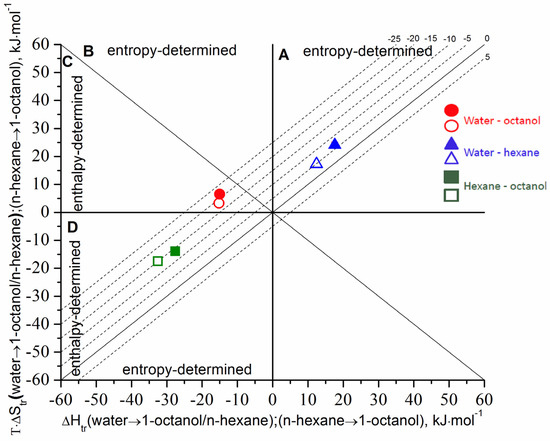 The comparative analysis revealed that the hypothetical transfer functions (derived from the solvation parameters; see Section 3.3 Table 4) agree with the parameters derived from the distribution experiments (“real” transfer) (Table 6). In order to illustrate the regularities following from the comparison of the enthalpy and entropy contributions to the transfer Gibbs energy, the diagram approach was applied (Figure 5). A detailed description of the regions on the diagram has been reported by us before [14].