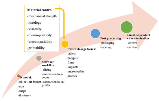 To design and produce pharmaceutical dosage forms by 3D printing, several factors must be taken into consideration, including: (i) the computer-aided design (CAD) software characteristics in relation to the technological platform that will translate the digital design into the 3D object and the type of pharmaceutical dosage form to be generated/formulated (shapes, size, and thickness), (ii) the thermoplastic and rheological behavior of the polymer and other formulation additives, (iii) the type of API to be impregnated and its compatibility/miscibility with the other formulation excipients, and (iv) the effect of the applied technology to the stability of the API. Furthermore, environmental impositions can also affect the quality of the finished product. For equipment without a controlled printing compartment, the ambient conditions can impact the printability and the quality of the printout. Consequently, the FDA guidelines for additive printing enumerates key considerations based on the dimensions, compartment area, and orifice/nozzle type, among others, required for optimized printout [25]. The pre-designed dimensions define the dose of loaded API according to individual patient needs. Once the design is converted to a digital file, the software converts the stereolithographic (STL) file or 3D Manufacturing Format (3DMF) to generate a g-code (computer numerical control programming language) that requires files to be compatible across the different software applications used and the 3D printers. The file is processed for printing by manual controls on the 3D printer (Figure 1). Of relevance to the remit of this review is the nature of the material used for printing, as it relates to suitability for human consumption biocompatibility, toxicology, and biodegradability profiles. After printing is complete, post-processing of the built dosage form (packing and labeling) takes place. Finally, the finished dosage form is ready for in vitro and in vivo characterizations depending on the type of the dosage form [25].