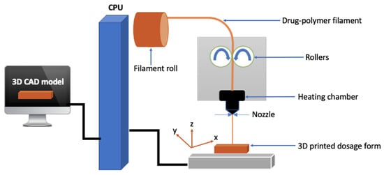 Fused deposition modeling (FDM) 3D printing works based on the principles of hot-melt extrusion, and it is well known in the field of pharmaceutical technology dating as early as the late 1990s [43]. It is arguably the most popular and widely applied additive manufacturing technique in dosage form engineering. Indeed, publication in FDM 3D printing has shown geometric progression since 2010 at the expiration of the first patented FDM [43] product. Furthermore, in the last six years, there has been an over 2000-fold increase in the number of published articles related to FDM 3D technology [44]. Thanks to its simplicity, it is applicable to the fabrication of on-demand dose-flexible printouts, involving fewer processing steps and thus is cost-effective [43,45,46]. In this technique, thermoplastic polymer(s) preferably impregnated with API in filaments via hot-melt extrusion is loaded to the nozzle of the printhead, with a specific diameter at a defined temperature. The molten API-loaded filament is deposited on the printing plate layer-by-layer to generate a 3D object based on the CAD. The printhead moves in 3-dimensional (x, y, z) coordinates and successive molten API-loaded filament deposit to the preceding layer (Figure 2). The printing plate, which could also be heated at a specific temperature moves one step lower, or the nozzle moves one step upward to allow for subsequent deposition to occur. The nozzle temperature can be adjusted according to the thermal properties of the API and/or the API-loaded filament as well as the rheological properties of the extrudate [24,43]. Thermoplastic polymers commonly used in FDM include acrylonitrile butadiene styrene (ABS), polycarbonate (PC), polylactic acid (PLA), polystyrene (PS), polyamide (PA), polyether ether ketone (PEEK), and lignin [47,48]. However, not all are suitable for 3D FDM fabrication of pharmaceutical dosage forms for human consumption due to safety concerns.