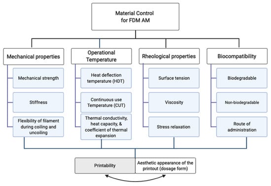 The choice of the right material for a successful FDM 3D printing is crucial to the printing process once the FDM 3D printer design is selected. Although the environmental conditions such as ambient temperature and relative humidity have been shown to significantly influence the material behaviors during and after 3D printing [20], the intrinsic property of the material is more critical since the environmental condition can be controlled. Mechanical strength, operational temperature, rheological properties, biocompatibility, and biodegradability are some of the critical quality attributes to consider when selecting a thermoplastic material for fabrication using FDM 3D printing technology (Figure 3) [49].