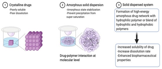 Various techniques have been employed to enhance the solubility, dissolution rates, and ultimately the oral bioavailability of poorly soluble APIs, among which include solid dispersion [82,83], pH modification, crystal modifications (co-crystals, polymorphs, and salts), amorphization, surfactant systems, particle size engineering, cyclodextrin complexation, and lipid-based formulations [83,84,85,86,87]. Solid dispersion is feasible, easy to formulate, economical, and has been extensively employed in this regard [83,85,87]. Solid dispersions date back to 1961 [88] and have been refined over the years with current application on hydrophobic APIs, typically Class II and IV drugs of the Biopharmaceutics Classification System (BCS). The resultant solid dispersed system accounts for improved solubility of the API through intercalation of the crystalline domains with dispersant that transforms it to an amorphous or mono-molecularly dispersed state [83,89]. Furthermore, enhanced wettability, dispersibility, and reduced aggregation of API augments the process of solution [89]. Inclusion of surfactants can further improve solubility [83].