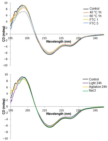 The characteristic Far UV spectra of the nivolumab control and stressed samples are shown in Figure 1. The CD spectrum of the control sample was characterised by the wavelength of 209.7 ± 0.1 nm with ellipticity = 0, by the wavelength of the minimum at 218.0 ± 0.4 nm and by a shoulder at 228.7 ± 0.1 nm. As regards the stressed samples, the three aforementioned checkpoints were monitored in order to detect any changes in the secondary structures of nivolumab. The results obtained (Table 1) show that the characteristic wavelengths in the stressed samples remained unchanged with respect to the control sample, so indicating that the various stress tests we performed did not cause any changes in the secondary structure of nivolumab.