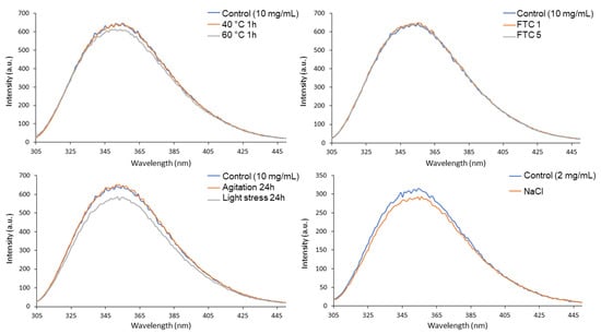 Figure 2 shows the fluorescence spectra for the control and stressed samples of nivolumab. Most of the spectra are very similar in terms of both shape and intensity. The only spectrum to show different intensity was the one obtained after exposing the nivolumab sample to light, which showed decreasing intensity due to a decrease in the fluorescence signal of the tryptophan residues of nivolumab. This is probably due to degradation, as light stress is a well-known oxidising agent [30]. Tryptophan residues may be oxidised, so decreasing the intensity of the IT-FS spectrum. This degradation could lead to differences in long-term stability, bioactivity and immunogenicity [31].