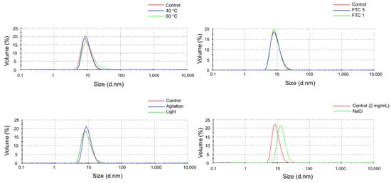 DLS results are shown in Table 4. Particulate size distributions by volume in the nivolumab (Opdivo®, 10 mg/mL) medicine and stressed samples are shown in Figure 3. Control samples (Opdivo®, 10 mg/mL nivolumab) showed a single population of particles attributed to the monomers of nivolumab with a hydrodynamic diameter (HD) of 9.7 ± 3.2 nm and 9.3 ± 3.2 nm for control 1 and control 2, respectively (two control samples were considered as the analyses were performed on different days). All the stressed samples remained unaltered, with no new particulate population detected up to 10 μm diameter size. All the samples had monomer populations of similar size, except for the one exposed to high temperature (60 °C, 1 h), which showed a slight increase in the HD. This could be attributed to increased hydration of the nivolumab monomers at this temperature, which was close to the temperature at which the secondary structure of nivolumab begins to degrade (as demonstrated above in the temperature ramp).