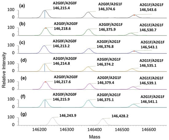 Deconvoluted mass spectra for nivolumab samples (10 mg/mL) showing the mass isoform profile with their proposed N-glycoforms: (a) fresh/control sample; (b) 40 °C/1 h exposure stress; (c) 60 °C/1 h exposure stress; (d) FTC 1; (e) FTC 5; (f) agitation stress; and (g) light stress.