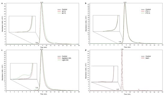 During the course of the aggregation study, we had to replace the SEC column we were using with a new one. This change resulted in a modification of the chromatographic profiles as the new column showed higher peak resolution capability. In the chromatogram in Figure 5d, the chromatographic peaks for the control and NaCl stressed samples are thinner and the retention times are shorter than the chromatograms in the other panels (a, b and c), because the NaCl stress study was carried out using the new column.