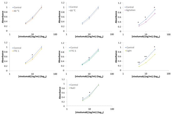 Once the ELISA had been fully validated, it was used to assess the biological activity of the stressed nivolumab samples. Figure 6 shows the results of the ELISA assays. Each stressed sample was analysed by obtaining the calibration graph, which was compared with the graph obtained in the analysis of the control (fresh) samples. In order to detect statistically significant differences, a Student’s t analysis was carried out as a means of comparing the experimental data from control and stressed samples: in Figure 6 the results marked with asterisks are significantly different (one asterisk, p-value < 0.05) and very significantly different (two asterisks, p-value < 0.001) from the control. The results show that the samples of nivolumab subjected to heat (40 °C/1 h and 60 °C/1 h) retain their functionality as the control sample. The samples subjected to stress by agitation and light exposure showed a clear loss in PD-1 binding capacity, as revealed by the shift towards lower absorbance values of the graphical function for the stressed samples as compared to the graphical function for the control samples; a remaining PD-1 binding capacity of 80% (agitation) and 70% (light stress exposure) was estimated, after assuming a binding capacity of 100% in the control samples in each graph (Table 9). In the case of the samples subjected to FTC 1 and 5, results indicated a slight decrease in PD-1 binding capacity to PD-1 with respect of the control samples, estimating the remaining biological activity at around 90% for both samples. This is in line with the instruction in the Opdivo® technical reports about not freezing the medicine [4]. The ELISA assays also revealed two significant values (Figure 6) in the sample subjected to high ionic strength stress (NaCl). Therefore, the biological activity of the stressed sample differs from the control samples, with a remaining activity of around 90% (Table 9).