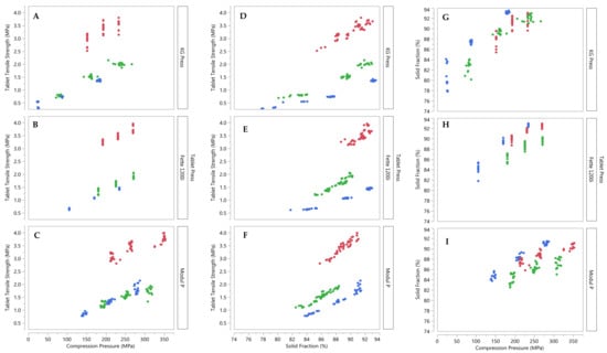 Compaction behaviour of three placebo formulations compressed on three tablet presses using processing parameters defined by the DoE. Red circles indicate formulation 1 (plastic), green circles indicate formulation 2 (elastic) and blue circles indicate formulation 3 (brittle). (A–C) Tabletability profiles, (D–F) compactibility profiles and (G–I) compressibility profiles of the three formulations on three tablet presses.
