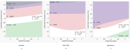 The process models developed were used to predict process conditions to produce tablets with the target tensile strength, porosity and disintegration time across a range of press speeds. The target tablet properties selected for this study were tensile strength 1 to 3 MPa, porosity 7% to 15% and disintegration time <5 min (<300 s). In this study, the required process conditions were determined keeping the pre-compression force constant at 1 kN. The combinations of process parameters predicted to produce tablets with the target properties are shown as white regions in Figure 3, Figure 4 and Figure 5.