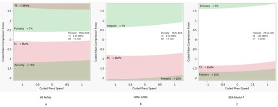 Two-dimensional contour profiles showing optimum process conditions for tablet tensile strength, porosity and disintegration time for formulation 3 at a set pre-compression force of 1 kN. (A) KG RoTab, (B) Fette 1200i and (C) Modul P. Coded main compression force and coded press speed values correspond to standardised units (Section 2.6). DT indicates disintegration time, and TS represents tensile strength. Regions of main compression force and press speed settings at which the tablets produced meet the target specifications of porosity 7% to 15%, tensile strength 1 to 3 MPa and disintegration time < 15 min are in white. Regions of main compression force and press speed settings at which the tablets produced were outside target specification are indicated by different shaded areas.