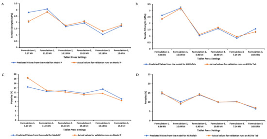 The tensile strength and porosity models were validated using mid-range process operating conditions on the KG RoTab and Modul P presses. Formulations 1–3, which were used to develop the models, were also used for model validation. Validation process parameters are listed in the supplementary information (Table S4). The predicted and actual values for porosity and tensile strength for the formulations on two presses are shown in Figure 6. For the three formulations, the process model accurately predicted the porosity values on KG RoTab (Figure 6D). The tensile strength was also accurately predicted, except for a slight overprediction for formulation 1 (plastic) and formulation 3 (brittle) at the higher and lower compression forces, respectively (Figure 6B). Overall, the models’ prediction capacity was less accurate for Module P. The greatest deviation from the predicted values of tensile strength and porosity was observed for formulation 1 (plastic) at the compression force of 7 kN on Modul P (Figure 6A,C).