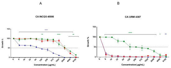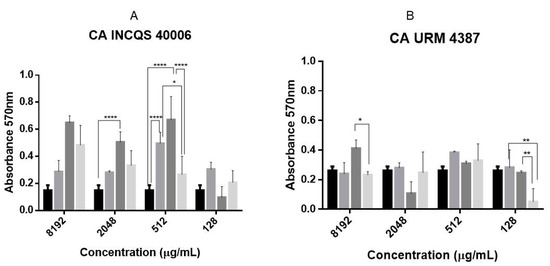 An initial solution was prepared by adding 1350 μL of doubly concentrated SDA and 150 μL of the fungal strain inoculum (corresponding to 10% of the total solution). Then, 150 μL of this solution was removed and added to each well on a microdilution plate. After this, the wells were filled with 100 μL of extract solution at concentrations ranging from 8192 to 8 μg/mL, and the plates were incubated at 37 °C. After 24 h, the readings were performed at 630 nm in a spectrophotometer (Thermoplate®). The optical density values were used to build the cell viability curve and calculate the IC50. Diluent (0.9% NaCl) sterility and growth controls were also used [48]. All tests were performed in quadruplicate.