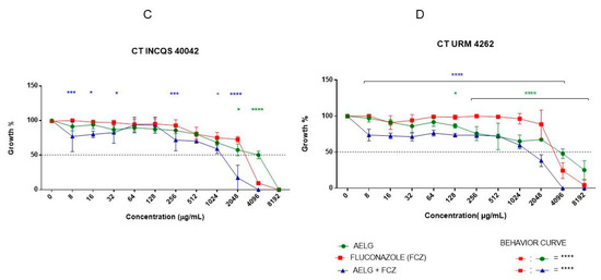 Cell viability curve of AELG alone and in combination with Fluconazole. Candida albicans INCQS 40006 (A), Candida albicans URM 4387 (B), Candida tropicalis INCQS 40042 (C) and Candida tropicalis URM 4262 (D). Statistical significance was determined considering the difference in relation to fluconazole, **** = p < 0.0001; *** = p < 0.001; ** = p < 0.01; * = p < 0.1.