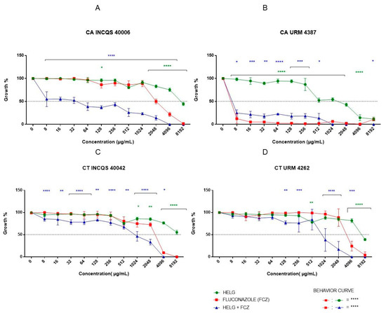 Cell viability curve of HELG alone and in combination with Fluconazole. Candida albicans INCQS 40006 (A), Candida albicans URM 4387 (B), Candida tropicalis INCQS 40042 (C) and Candida tropicalis URM 4262 (D). Statistical significance was determined considering the difference in relation to fluconazole, **** = p < 0.0001; *** = p < 0.001; ** = p < 0.01; * = p < 0.1.