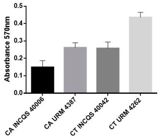 Among the yeasts included in this study, the URM 4262 strain of C. tropicalis demonstrated the highest (strong) biofilm-producing potential, while the other strains showed moderate activity. These findings differ from those observed by [35], who found that C. albicans are better biofilm producers than non-albicans strains. On the other hand, previous research has corroborated the here demonstrated evidence that C. tropicalis are among the main biofilm producers of its genus [36].
