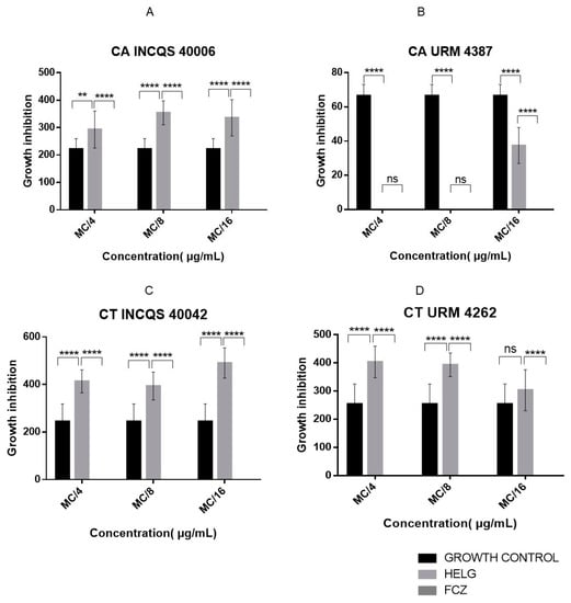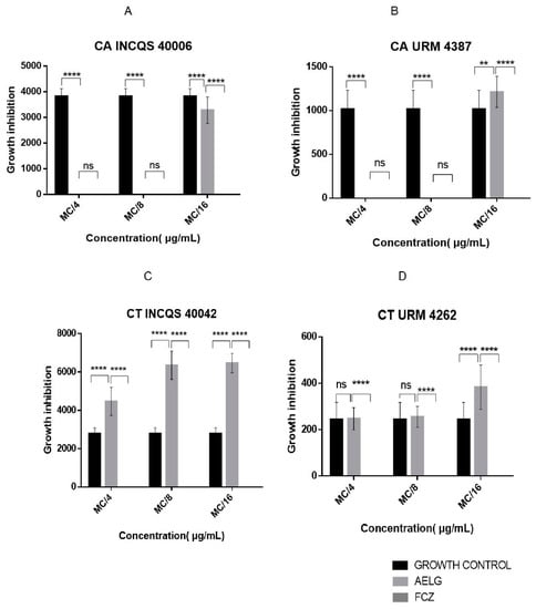 Effects of G. hirsutum aqueous extract and fluconazole on the morphological transition of Candida albicans INCQS 40006 (A), Candida albicans URM 4387 (B), Candida tropicalis INCQS 40042 (C) and Candida tropicalis URM 4262 (D). MC: Matrix Concentration (16.384 μg/mL); MC/4: 4.096 μg/mL, MC/8: 2.048 μg/mL, MC/16: 1.024 μg/mL; Growth inhibition—measured by micrometer-sized hyphae (µm); No bar—no hyphae growth. ** = p < 0.01, **** = p < 0.0001, ns = No Significant.