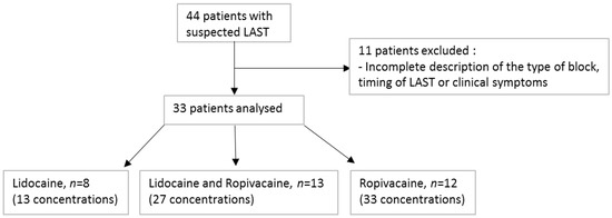 Riff, C.; Le Caloch, A.; Dupouey, J.; Allanioux, L.; Leone, M.; Blin, O.; Bourgoin, A.; Guilhaumou, R. Local Anesthetic Plasma Concentrations as a Valuable Tool to Confirm the Diagnosis of Local Anesthetic Systemic Toxicity? A Report of 10 Years of Experience. Pharmaceutics 2022, 14, 708. https://doi.org/10.3390/pharmaceutics14040708