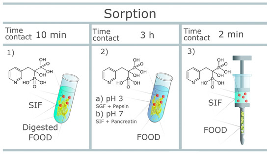 The aim of this study was to examine a series of food products in terms of their sorption capacity of bisphosphonates. A series of commonly eaten breakfast products was selected, and a procedure based on the following three methods (Figure 1) was applied for the purpose of the study: